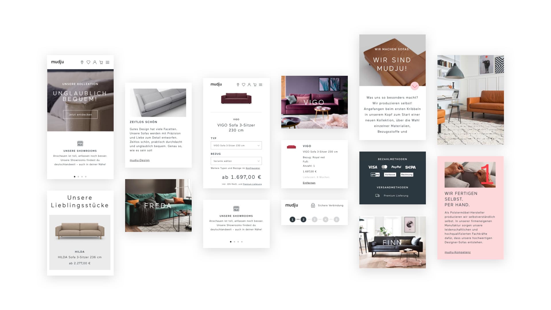 Die Produkte sind online und im Ladengeschäft erhältlich. Allerdings sind flächendeckende Beratung und Verfügbarkeit direkt zum Start nur schwer zu realisieren. Deshalb geht mudju beim Vertriebskonzept einen völlig neuen Weg. Der Verkauf bezieht lokale Möbelhändler als Showrooms mit ein. Anfassen, probeliegen, ausprobieren. mudju will zeigen, dass das auch beim Onlineshopping geht. Kosmonaut musste also eine Lösung bauen, die das Onlinegeschäft sowie den stationären Verkauf – der übrigens von lokalen Händlern organisiert wird – managt. Online in 3D Sofa-Kombinationen begutachten, Partnerhändler in der Nähe suchen und anschließend dort auch Probeliegen? Mehr Connected Commerce geht nicht!